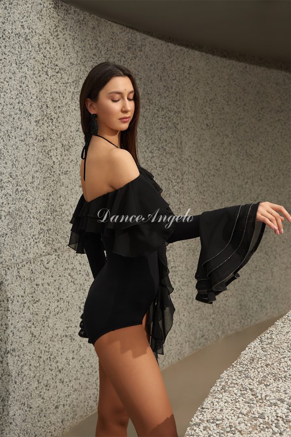 オフショルダーのフェミニンでゴージャスなレオタードです。