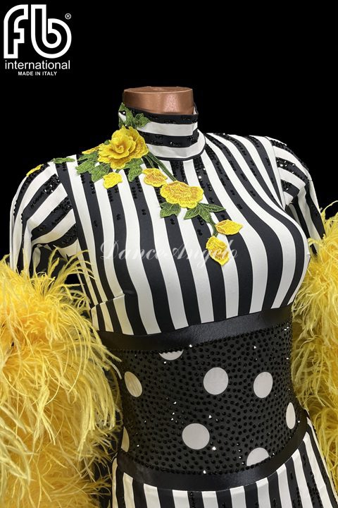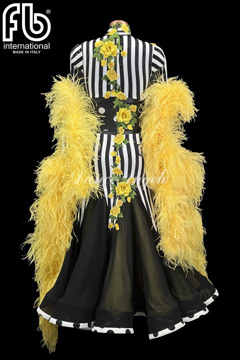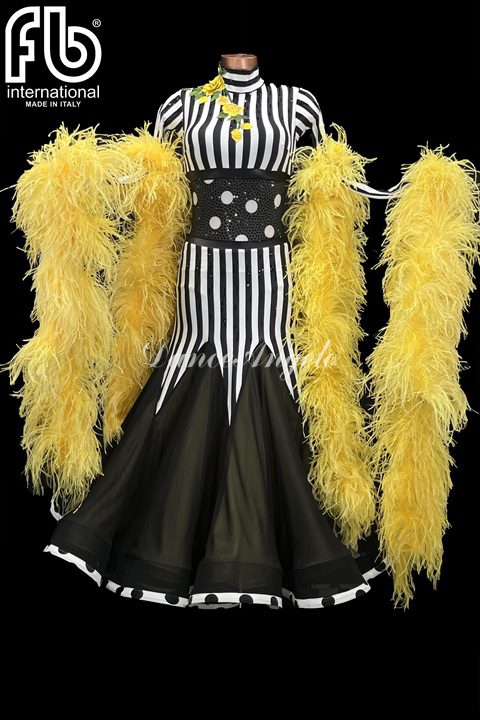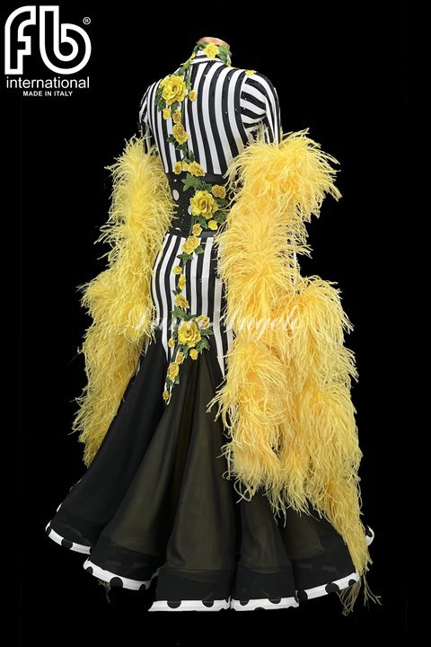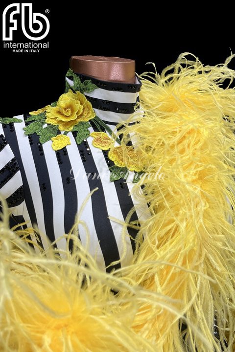 インパクトある白黒ストライプのボディに鮮やかな黄色のフェザーフロートを加え、パンチを利かせたドレスに仕上がっています。