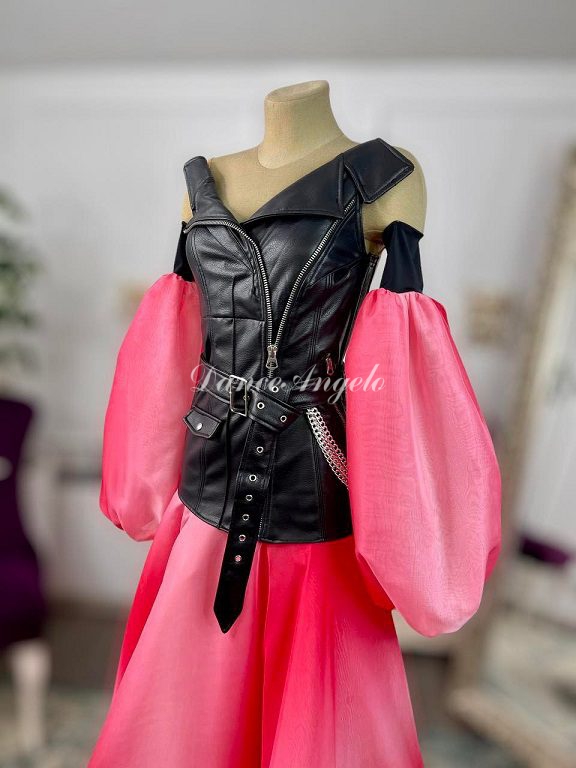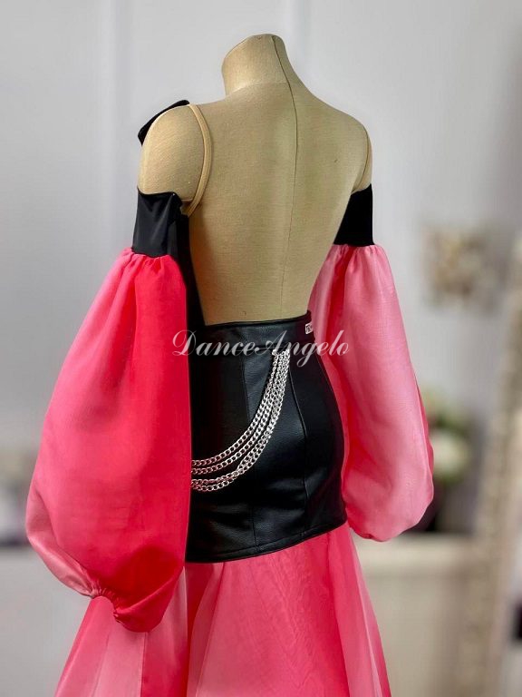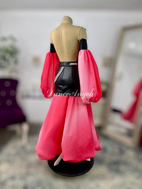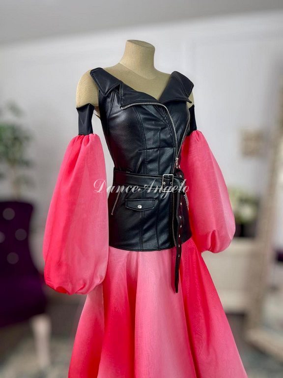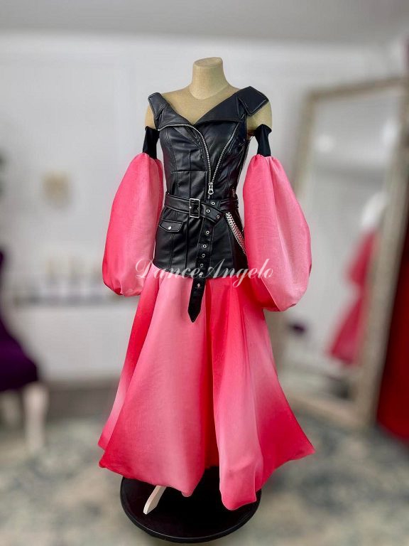 黒レザーはシャープさを、赤白グラデーションの袖とスカートのバルーンデザインはフェミニンな印象といった具合に対照的な魅力を持ったドレスです。