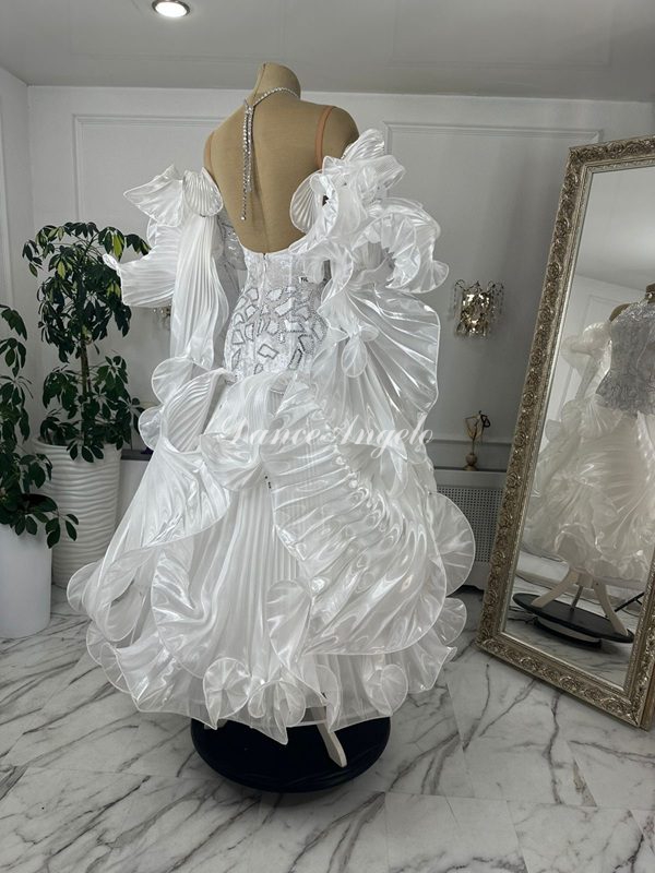 張りと光沢ある白のプリーツ加工生地の利点が十二分に活かされたデザインです。